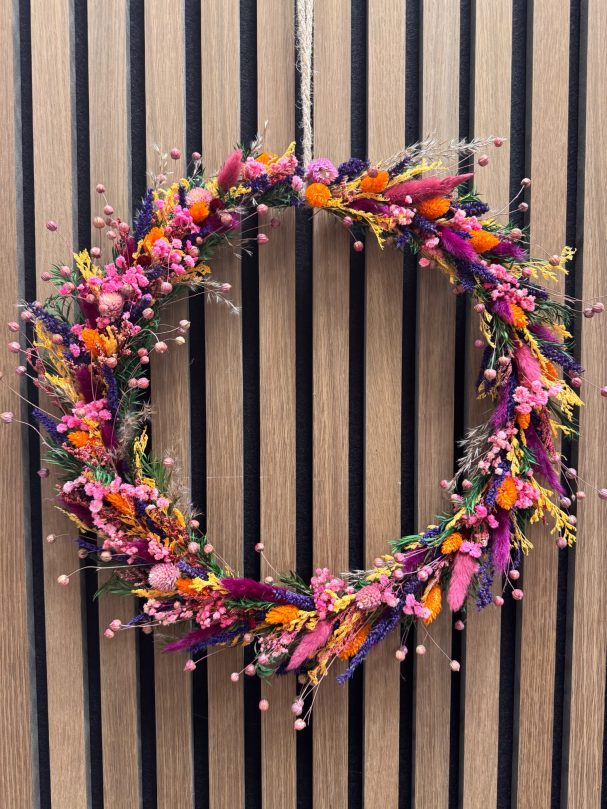 Tür Kranz herstellen mit Trockenblumen, Keramikpulver und Klötzchen